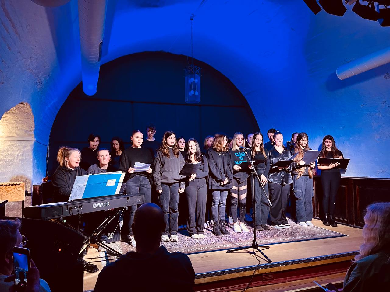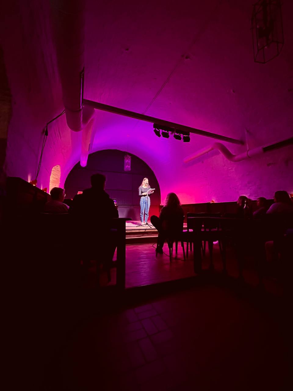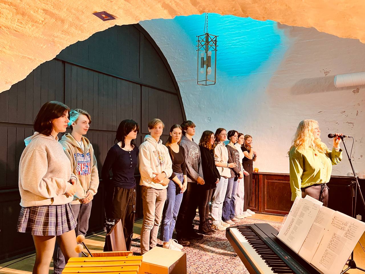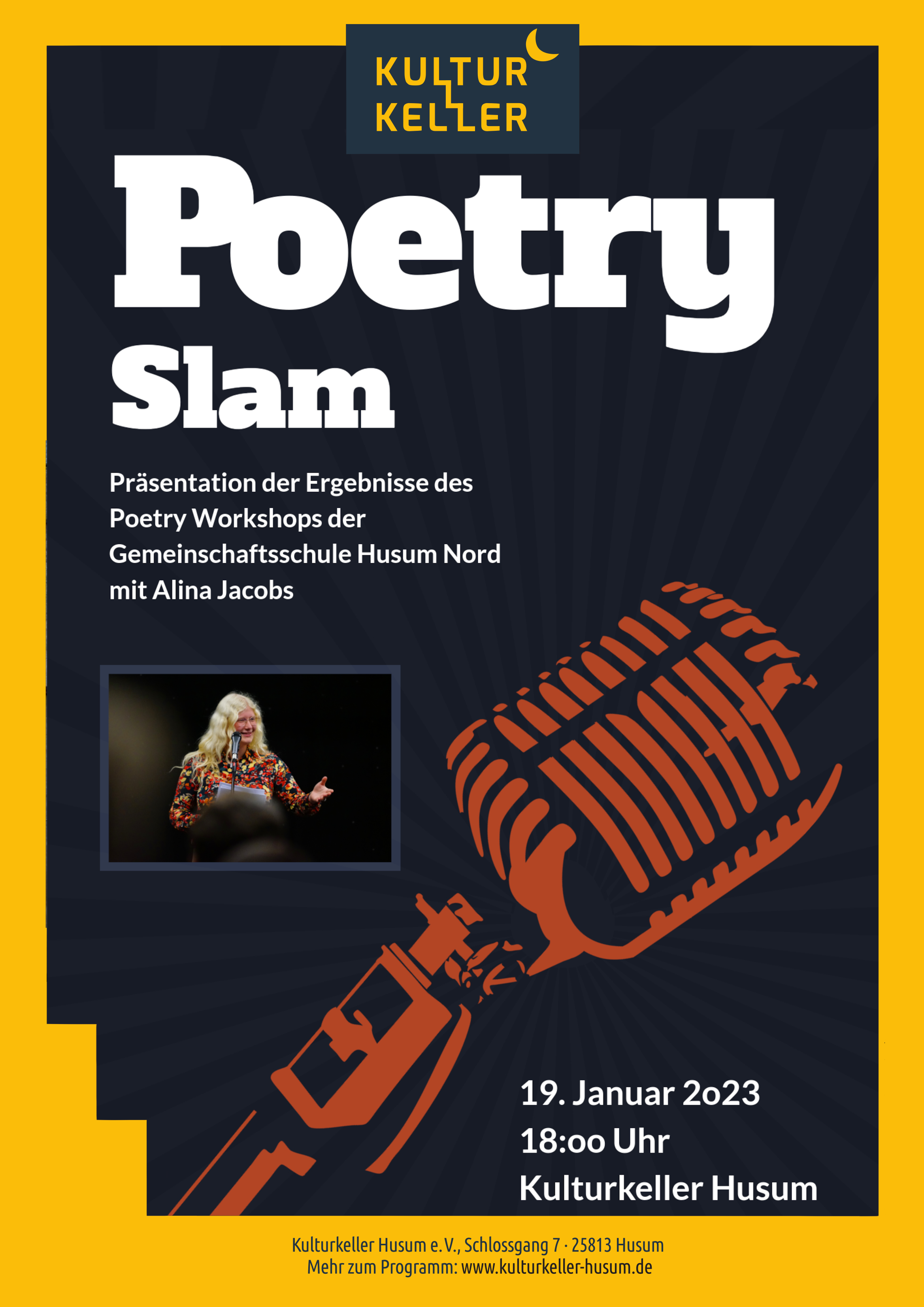 Am 19. Januar 2023 trafen sich 15 Schüler:innen aus den 9. und 10. Klassen der Gemeinschaftsschule Nord mit Alina Jacobs zu einem Poetry-Slam-Workshop im Kulturkeller Husum im Schlossgang. Alina Jacobs, Poetry-Slammerin und Gewinnerin des Margarete-Böhme-Preises 2022, begrüßte die Schüler:innen um 09.30 Uhr im Kulturkeller mit einem eigenen Text, einer kreativen Vorstellungsrunde und gab den Teilnehmer:innen verschiedene Übungen und Schreibimpulse mit auf den Weg, bevor es darum ging ganz eigene Texte zu verfassen. Gemeinsam arbeitete die Gruppe den ganzen Vormittag und Nachmittag und bereitete den abendlichen Poetry-Slam vor, zu dem Eltern, Freunde und das Kollegium eingeladen waren. Abends wurde es dann spannend. Der Chor der 9. Klassen kam in den Kulturkeller, um die Veranstaltung musikalisch einzurahmen und auch die Gäste trudelten nach und nach ein. Dann trugen fast alle Teilnehmer:innen ihre frisch geschriebenen Texte vor. Viele lasen überhaupt das erste Mal in ihrem Leben einen eigenen Text vor Publikum vor. Dafür wurden alle mit großem Applaus belohnt.
